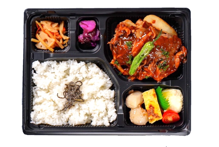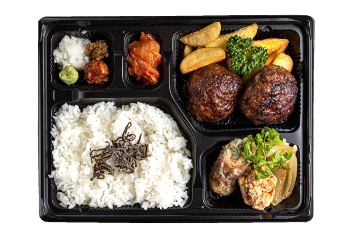 【内容】 国産牛ハンバーグ・ポテト・季節のお惣菜・漬物 等