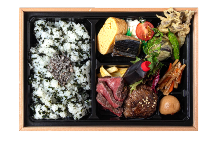 国産牛のランプステーキと名物ハンバーグ、季節の天ぷらなど全9種類のおかずで彩り豊かで豪華なお弁当です。