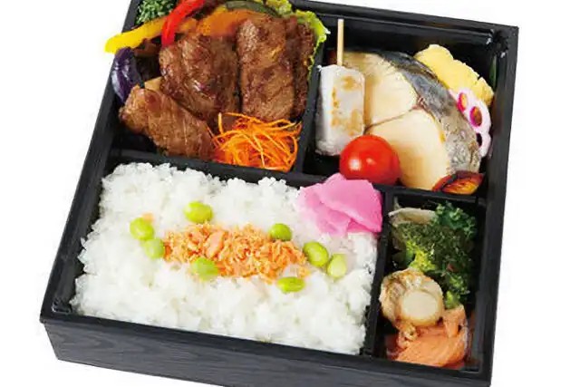 ステーキ、焼魚をメインに炊き合わせ、だし巻きたまごが入った幕の内お弁当です。