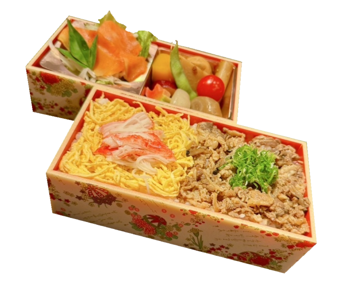鮭の大トロ部ハラスのみを贅沢に使用し皮まで美味しく焼き上げました。厳選牛ローストビーフとバランスよく入った副菜で華やかなお弁当です。