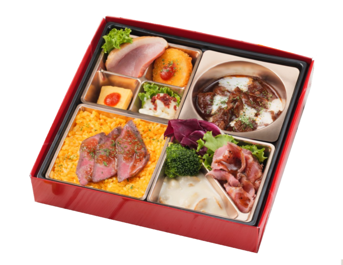 国産黒毛牛のステーキ重・牛のワイン煮込み・ホタテのクリーム煮・当店自慢のローストビーフ等々、冷めても美味しいにこだわり抜いたワンランク上の御弁当をお楽しみください!