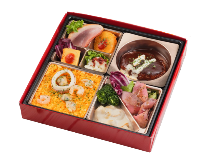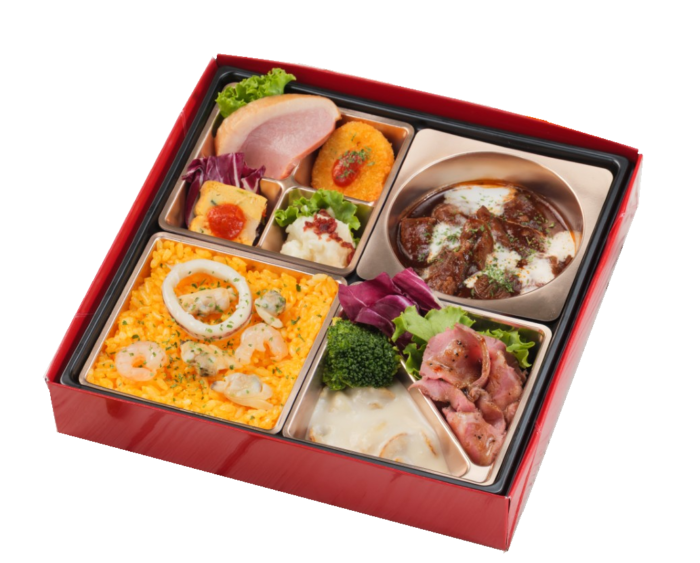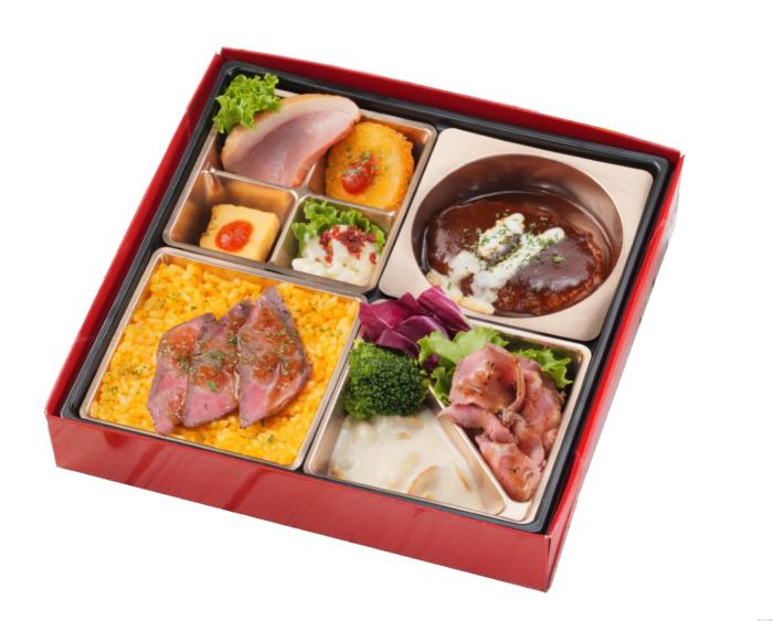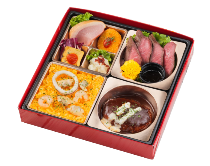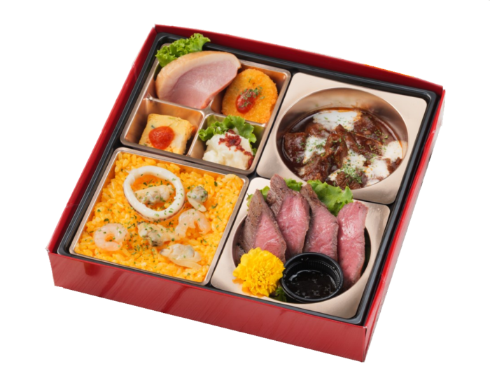 【内容】 ステーキ重(特製サフランライス、黒毛牛ステーキ、トリュフソース)、ローストビーフ、特製デミグラスソースのハンバーグ、ベビーホタテのクリーム煮、鴨ロース、トリュフ入りクロケット、トルティージャ、スモークサーモン 等