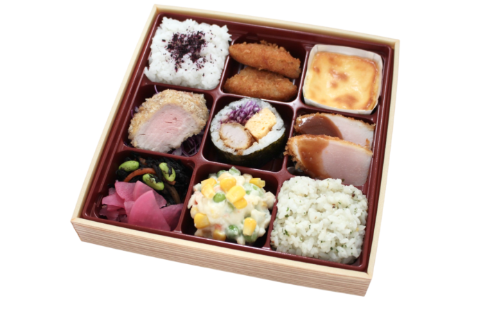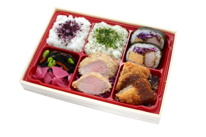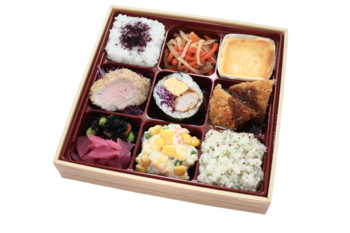 【内容】 ゆかりご飯・メンチカツ・チーズケーキ・ヒレカツ・キンパ・チキンカツ・ひじき漬物・ダイスサラダ・バセリバターリゾット 等