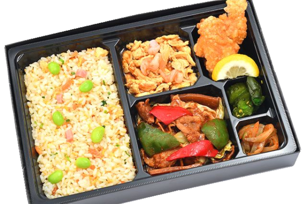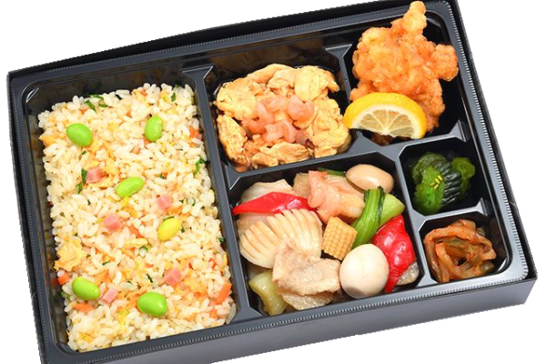 • 野菜や海鮮をたっぷり入れた八宝菜がメインのお弁当です。枝豆の食感が楽しい炒飯は、冷めてもおいしい特製メニューです。
