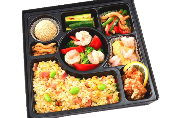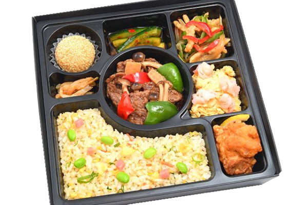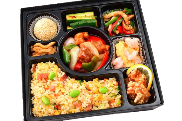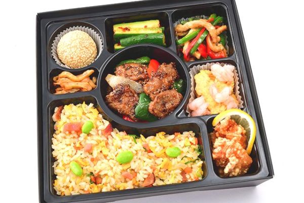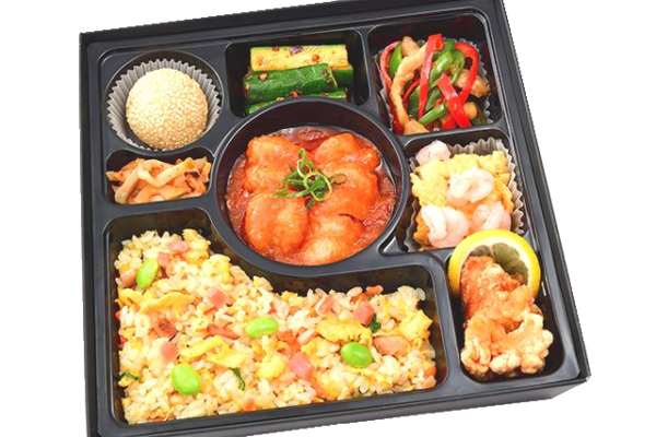【内容】 牛肉の黒胡椒炒め・焼飯・ごま団子・きゅうりのピリ辛和え・チンジャオロー・ザーサイ・玉子のえび甘酢あんかけ・鶏の唐揚げ・レモン 等