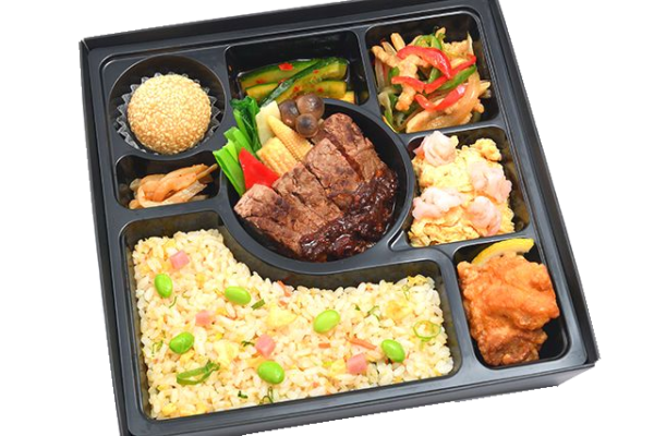 【内容】 牛ステーキXO醤ソース・焼飯・ごま団子・きゅうりのピリ辛和え・チンジャオロース・ザーサイ・玉子のえび甘酢あんかけ・鶏の唐揚げ・レモン 等