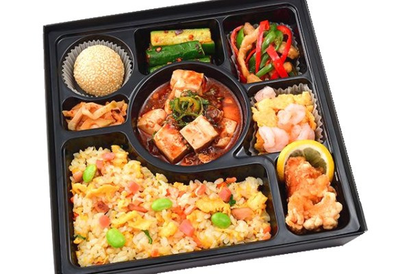 【内容】 麻婆豆腐・焼飯・ごま団子・きゅうりのピリ辛和え・チンジャオロース・ザーサイ・玉子のえび甘酢あんかけ・鶏の唐揚げ・レモン 等