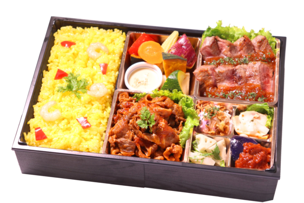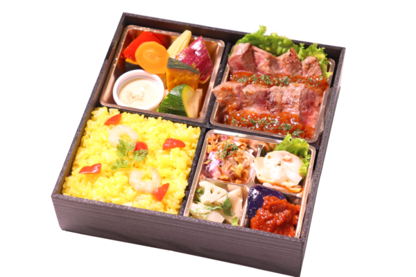 特選牛ステーキとグリルチキンのトマトソースが入った、ボリュームたっぷりのお弁当です。