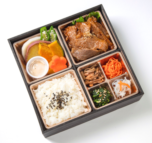 特選焼肉を150g、季節の副菜と一緒にお召し上がりいただける、バランスの良いお弁当です。