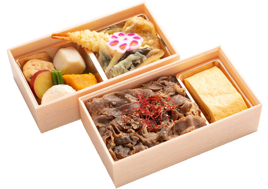 100年以上培った職人の技術で丁寧に手作りで巻きあげる、鰹と昆布を煮出しただし汁を使っただし巻きと穴子飯、京風和牛すき焼き、天ぷら、京風煮物盛合わせを彩りよく盛付けた最高に贅沢弁当。