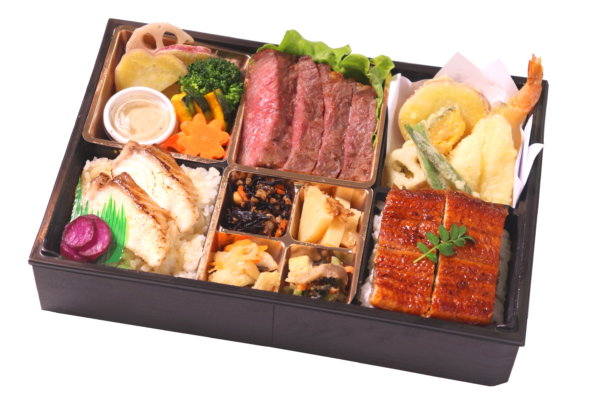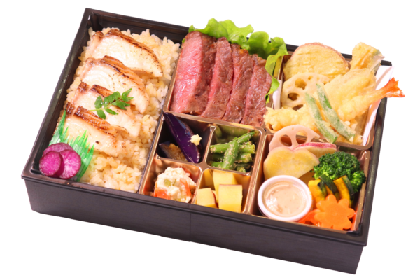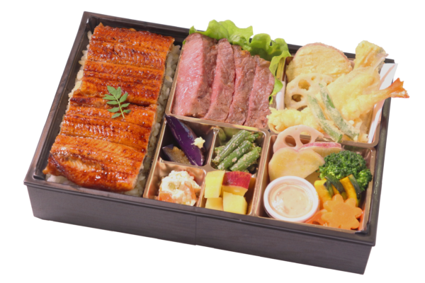 【内容】 うな重・ステーキ・天ぷら・季節の惣菜4品・蒸し野菜 等