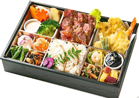 【内容】 ステーキ(150g)重・季節の惣菜8品・天ぷら・蒸し野菜 等