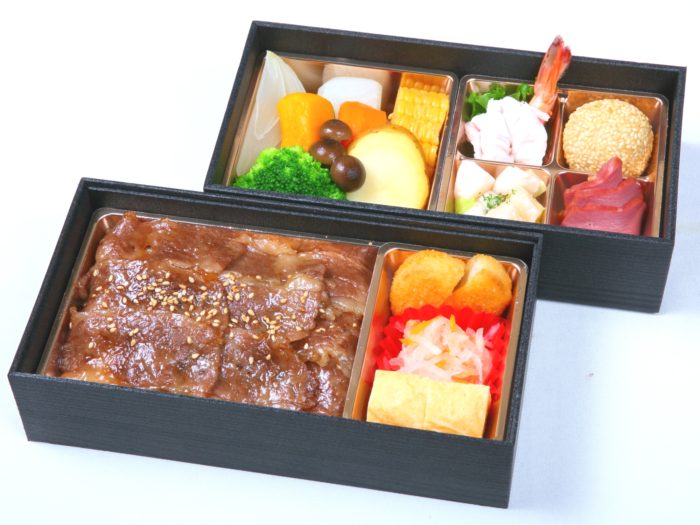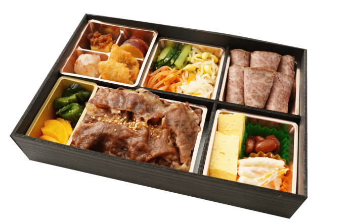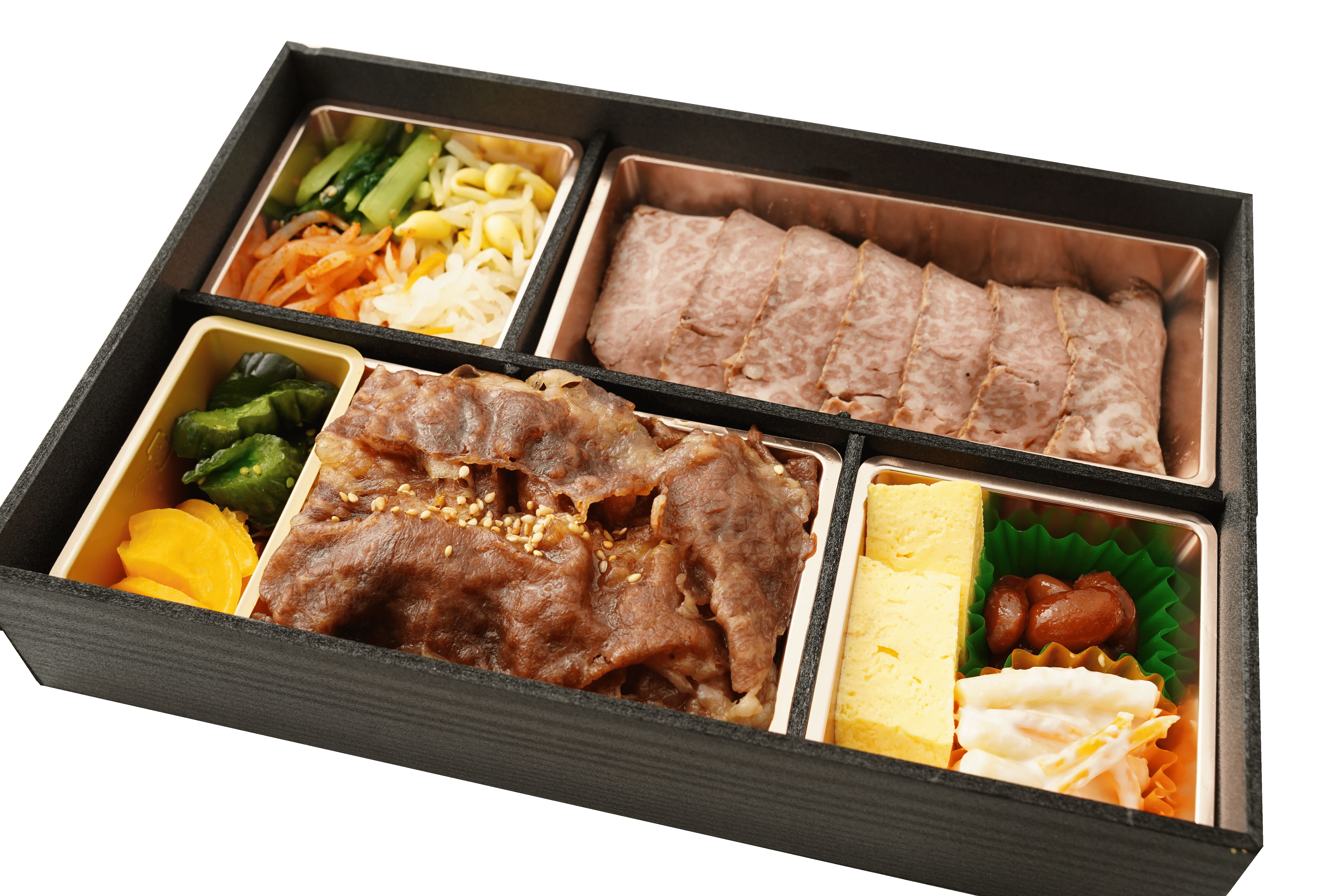 • A5ランクの黒毛和牛を贅沢に使用し、ジューシーな旨味をそのまま閉じ込めた焼肉重と、しっとり柔らかなA5ランク黒毛和牛霜降りローストビーフに彩り豊かな副菜を添えた豪華なお弁当です。
