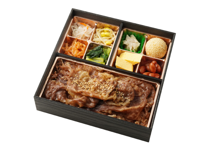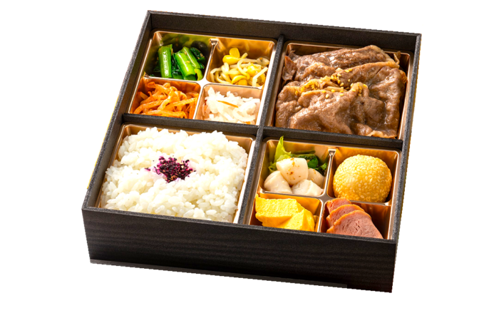 • A5ランクの黒毛和牛を贅沢に使用し、ジューシーな旨味をそのまま閉じ込めた焼肉重と、しっとり柔らかなA5ランク黒毛和牛霜降りローストビーフを一度に味わえる贅沢なお弁当です。