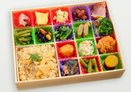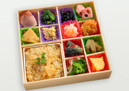 出汁の旨味があふれる自慢の炊き込みご飯に、12種類のこだわりのおかずが楽しめる見た目も華やかな満足度の高いお弁当に仕上げました。