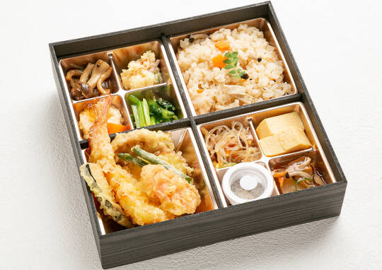 【内容】 天麩羅・ポテトサラダ・出汁巻き・季節のナムル・季節のお惣菜4種・炊き込みご飯[約160g] ※仕入れ状況により、副菜の内容が変わる場合がございます。