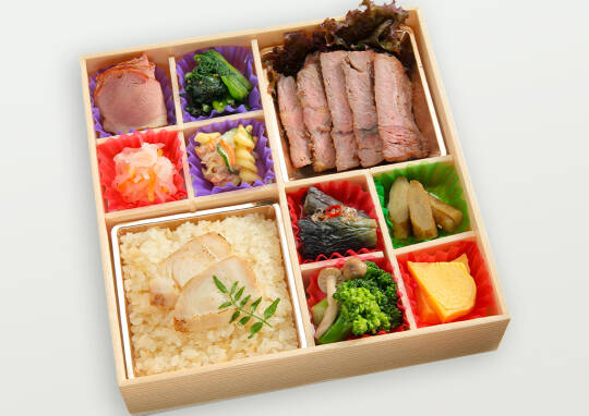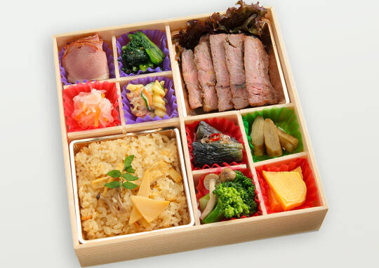 肉専門店ならではのクオリティーが自慢の牛ステーキは、冷めても柔らかジューシー! メインを彩るお惣菜と、ふっくら炊き上げた出汁の美味しさ際立つ鯛めしと共にご賞味下さい。