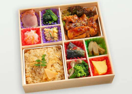 出汁が自慢の炊き込みご飯に、メインはご飯と相性抜群のてりやきチキン。8種類のこだわりのおかずも楽しめる豪華な内容となっています。 柔らかジューシーなてりやきチキンは一度食べると病みつきになる美味しさです。