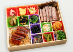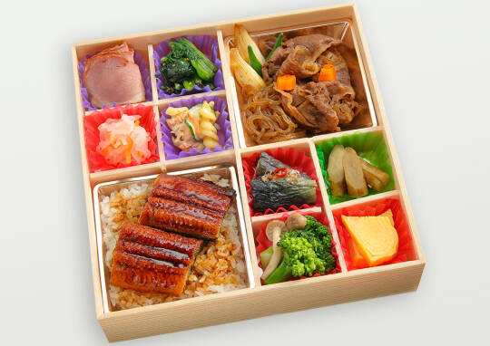 【内容】 牛ステーキ・ブロコッリーとしめじの和え物・梅レンコン・揚げ鶏のわさびソース和え・ひじき煮・マカロニサラダ・大根なます・小松菜ごま油和え・だし巻き玉子・季節のお惣菜4種・鰻重[約160g] ※仕入れ状況により、副菜の内容が変わる場合がございます。