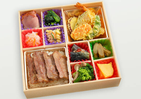肉専門店自慢の牛ステーキ重に、丁寧に揚げた天ぷら6種。 12種類のこだわりのお料理も少しずつ楽しめるこだわり溢れる贅沢なお弁当です。