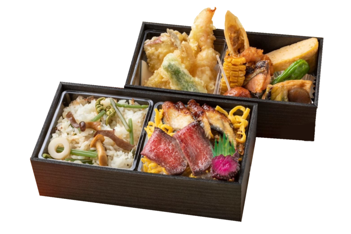• 冬季限定!脂の乗ったサイコロステーキと二色丼。彩り豊かな二段重です。